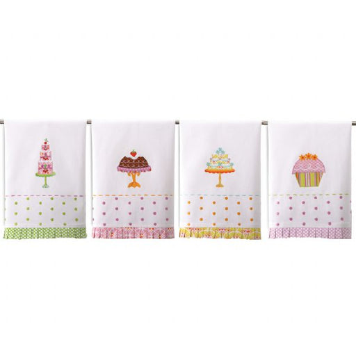 Life is sweet! A colorful collection of 4 scrumptious cake guest towels. Each is decorated with a unique embroidered cake, dots and trimmed with pr...