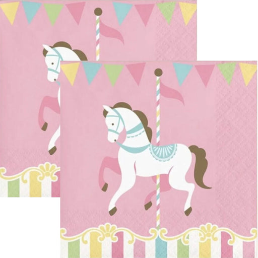 Decoupage Pink Carousel 5″ Napkins – 2 pcs Pretty pink and cream Carousel cocktail paper napkins with a single horse. Features multi-colored banner...