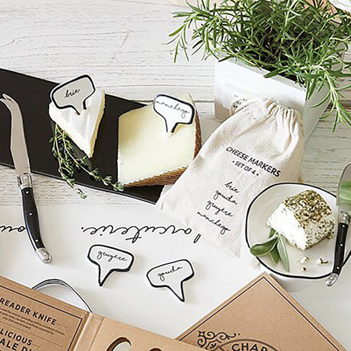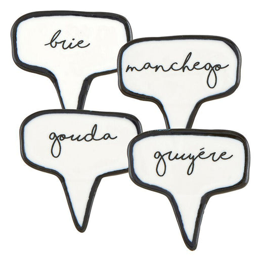 Details: Set of 4 include: Gouda, Manchego, Brie, Gruyère Classic Black and White color combination Material: Ceramic Size: 2" W x 2" H Storage bag